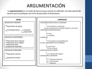 La argumentación defiende una idea aportando razones para justificarla y persuadir al receptor. Puede clasificarse según su función, contenido o finalidad. Utiliza diferentes tipos de lenguaje como la lógica, analogías o ejemplos. Los textos argumentativos combinan partes expositivas y de argumentación, e incluyen introducción, desarrollo y conclusión.