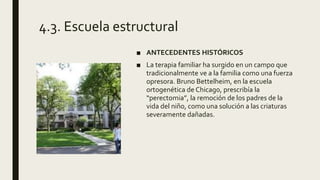 Este documento describe los fundamentos de la escuela estructural en terapia familiar. Explica que la escuela estructural se enfoca en las interacciones y estructuras familiares que mantienen los síntomas. El terapeuta trabaja para reestructurar las relaciones familiares y acercarlas a un modelo funcional mediante técnicas como cambiar roles y fronteras familiares. También describe las características del terapeuta estructural como participar activamente en la familia para observar y modificar las interacciones.