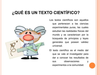 El documento describe las características de un texto científico. Explica que los textos científicos tienen como objetivo informar sobre el progreso de la ciencia y la tecnología de manera clara, precisa y objetiva. Detalla las características comunicativas, textuales y léxicas-semánticas de este tipo de textos, así como las cualidades de claridad, precisión, verificabilidad, universalidad y objetividad que los definen. Además, explica los elementos clave de un artículo científico como el título,