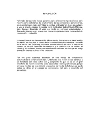 El documento resume un trabajo colaborativo de tres estudiantes sobre Gabriel García Márquez y su obra. Analizan el video "La escritura embrujada" que habla sobre la vida y obra del escritor colombiano. Explica que García Márquez se inspiró en las historias de su abuelo y en los lugares de su infancia para crear la novela Cien Años de Soledad. También describe cómo el autor desarrolló su estilo único a través de la lectura de otros escritores y el descubrimiento de las similitudes entre su tierra n