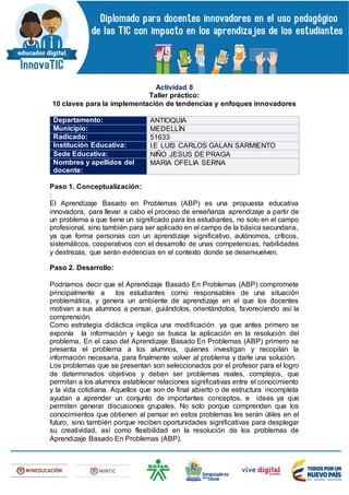 Este documento describe el Aprendizaje Basado en Problemas (ABP) como una estrategia educativa innovadora que utiliza problemas significativos para los estudiantes como punto de partida para el aprendizaje. El ABP involucra a los estudiantes en la investigación y resolución colaborativa de problemas, desarrollando habilidades para aprender. Los docentes guían a los estudiantes en el proceso de ABP pero los estudiantes son responsables de su propio aprendizaje. El ABP ha demostrado promover el aprendizaje significativo, el des