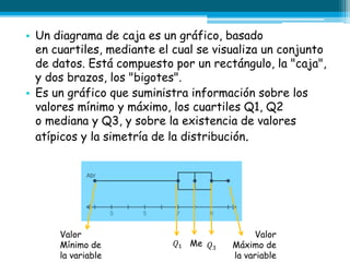 Este documento explica qué es un diagrama de caja y bigote, el cual es un gráfico que resume un conjunto de datos mostrando valores mínimo y máximo, los cuartiles Q1, Q2 (mediana) y Q3, y valores atípicos. Luego presenta una serie de ejercicios prácticos sobre el análisis de datos usando este gráfico.