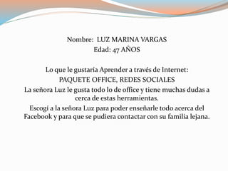 Este documento presenta información sobre una capacitación en habilidades digitales para Luz Marina Vargas, una mujer de 47 años. El estudiante Wilder José López enseñó a Luz Marina sobre el paquete Office y las redes sociales como Facebook para que pudiera comunicarse con familiares lejanos. Las clases durante una semana fueron amenas y Luz Marina aprendió rápidamente las aplicaciones.