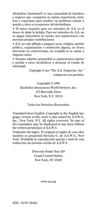Alcohólicos Anónimos es una comunidad de hombres y mujeres que comparten su experiencia para resolver su problema común con el alcoholismo y ayudar a otros. El único requisito para ser miembro es el deseo de dejar la bebida. Su objetivo es mantenerse sobrios y ayudar a otros alcohólicos a alcanzar la sobriedad.