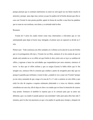Este resumen describe un reporte de lectura sobre la obra de teatro "El no" de Virgilio Piñera. Consta de cinco actos que narran la historia de una pareja de novios, Emilia y Vicente, que llevan 40 años de relación sin casarse, a pesar de la presión de los padres de Emilia. La madre de Emilia enloquece al no poder aceptar que su hija no se case, mientras la pareja insiste en que su amor es más allá del matrimonio.