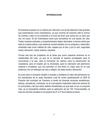 Este documento presenta un proyecto educativo dirigido a fomentar el patriotismo en los estudiantes de la sede educativa rural El Limón en el departamento de Norte de Santander, Colombia. El proyecto busca fortalecer el sentido de pertenencia e identidad nacional de los estudiantes a través de actividades académicas, lúdicas, recreativas y artísticas que involucren a la comunidad educativa. El proyecto se implementará en los grados 2o a 5o utilizando las TIC y estará alineado con