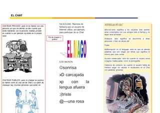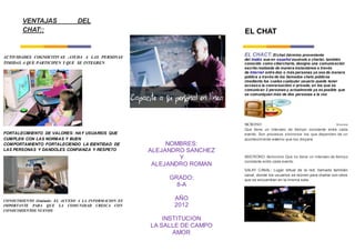 Este documento proporciona información sobre el chat y sus características. Define el chat como una comunicación escrita en línea entre dos o más personas de forma pública o privada. Explica que el chat puede ser síncrono, con eventos en tiempo real, o asíncrono, sin un intervalo de tiempo fijo entre eventos. También describe algunas ventajas como ayudar a personas tímidas a integrarse, y desventajas como la adicción, anarquía, malformación del lenguaje y acceso a contenido inadecuado.