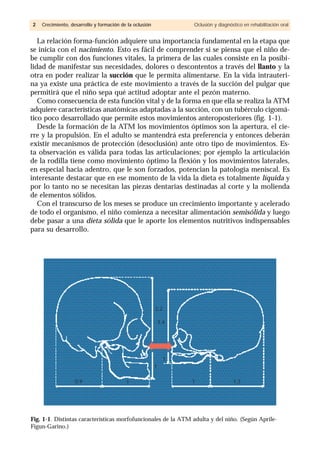 (1) El documento describe el desarrollo de la oclusión desde la vida fetal hasta la adultez, incluyendo los cambios en la forma y función de las estructuras orales como los dientes, huesos y músculos. (2) Explica que la dentición temporal tiene características como raíces largas que permiten una oclusión balanceada bilateral que estimula el crecimiento maxilar, mientras que los dientes permanentes erupcionan parcialmente formados para poder ajustarse a la oclusión. (3) El sistema se coordina de manera que la forma y