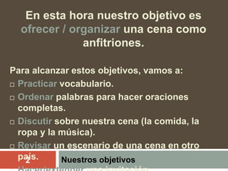 El documento describe una lección sobre cómo ofrecer una cena como anfitriones. La lección incluye objetivos como practicar vocabulario relacionado con las cenas y discutir detalles como la comida, la ropa y la música. También incluye una historia corta sobre una cena en la India donde los invitados deben permanecer inmóviles para no asustar a una cobra debajo de la mesa.