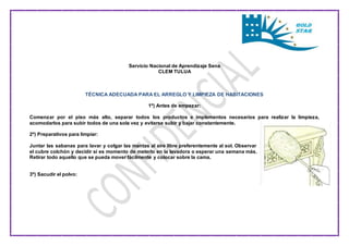 Este documento proporciona instrucciones detalladas sobre la limpieza y desinfección adecuadas de habitaciones en alojamientos, incluyendo los pasos para sacudir el polvo, limpiar muebles, tapizados, marcos, puertas, armarios y suelos. También incluye formatos para el control y seguimiento del programa de limpieza y desinfección, con responsables, frecuencias y observaciones para cada área.