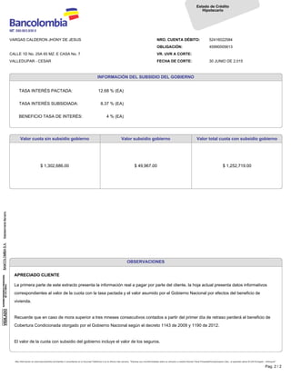 Este documento es un estado de cuenta hipotecario de Jhony de Jesus Vargas Calderon. Muestra que la cuota número 47 de 60 está próxima a vencer, por un valor de 1,252,719 pesos colombianos. Actualmente hay 3 cuotas en mora por un total de 3,770,501 pesos. También proporciona detalles sobre los seguros, saldos, tasa de interés subsidiada y observaciones importantes.