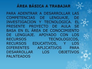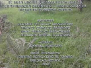 Este documento describe un proyecto de aula enfocado en mejorar las competencias de lenguaje, investigación y uso de tecnología en estudiantes de quinto grado. El proyecto busca motivar a los estudiantes a crear y embellecer textos sobre su entorno mediante el uso de las TIC. Se realizarán actividades como indagaciones sobre la vereda y entrevistas para recolectar información, y luego crear un cuaderno digital con el software Cuadernia para presentar los resultados. El objetivo es que los estudiantes mejoren la producción de textos