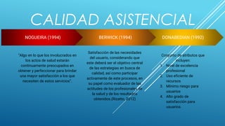 Este documento presenta información sobre indicadores de calidad en la atención de enfermería. Define indicadores como instrumentos de medición que permiten evaluar la calidad de procesos, productos y servicios para asegurar la satisfacción de los clientes. Explica diferentes tipos de indicadores como de estructura, proceso y resultado e incluye ejemplos de indicadores específicos para medir aspectos como la administración de medicamentos, prevención de caídas y úlceras por presión. Concluye que estos indicadores permiten identificar la percepción