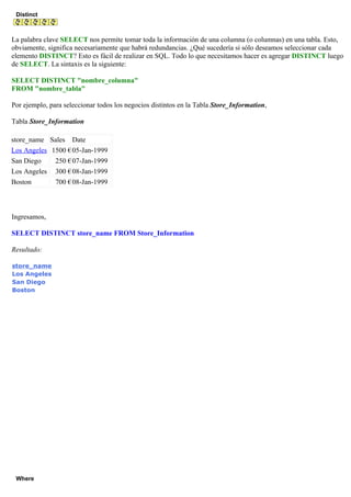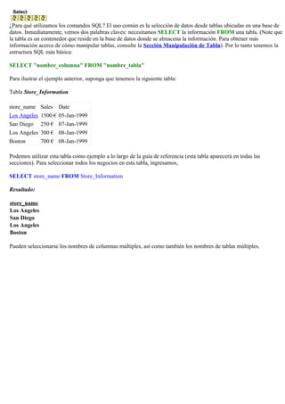 El documento explica cómo se utilizan los comandos SQL SELECT para seleccionar datos de tablas almacenadas en una base de datos. Explica que SELECT permite recuperar información específica de columnas y tablas, y que la estructura básica es SELECT 'nombre_columna' FROM 'nombre_tabla'. Luego, introduce palabras claves como DISTINCT, WHERE, BETWEEN, IN, LIKE, ORDER BY y funciones como COUNT, SUM, AVG, que permiten filtrar y ordenar los resultados de una consulta SQL de manera más específica.