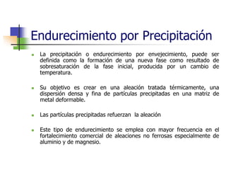 El documento describe diferentes tratamientos térmicos como el endurecimiento por precipitación, la recristalización y el trabajo en caliente. El endurecimiento por precipitación involucra la formación de una nueva fase a través de la sobresaturación de una fase inicial producida por un cambio de temperatura. La recristalización es un proceso de nucleación y crecimiento que elimina las tensiones internas en un material deformado. El trabajo en caliente deforma un material a alta temperatura para aprovechar simultáneamente el endurecimiento y el reblandecimiento por