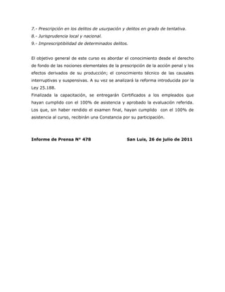 El Instituto de Capacitación e Investigación del Poder Judicial informó sobre un curso sobre la prescripción de la acción penal que se llevará a cabo del 8 al 22 de septiembre en las tres Circunscripciones Judiciales de la provincia. El curso constará de dos clases los días 8 y 15 de septiembre y una evaluación escrita final el 22 de septiembre, y abordará conceptos legales sobre la prescripción, causales de suspensión e interrupción, y efectos de la reforma introducida por la Ley 25.188. Los e