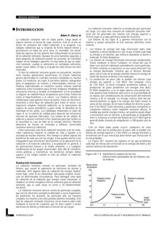 Este documento proporciona una introducción a los riesgos generales de la radiación ionizante. Explica que la radiación ionizante está presente de forma natural y tiene usos beneficiosos, pero también puede ser perjudicial si se administra en cantidades suficientes. Además, describe los tres tipos principales de radiación ionizante - directa, indirecta producida por partículas sin carga y radiación ionizante indirecta generada por fotones o neutrones - y sus mecanismos de interacción con la materia.