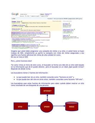 Este documento presenta los conceptos básicos del SEO (Search Engine Optimization), incluyendo objetivos específicos de proyectos de SEO interno y externo. Explica cómo funcionan los factores on-site y off-site que los motores de búsqueda usan para ranquear sitios web, y distingue entre técnicas de SEO éticas ("white hat") y no éticas ("black hat").