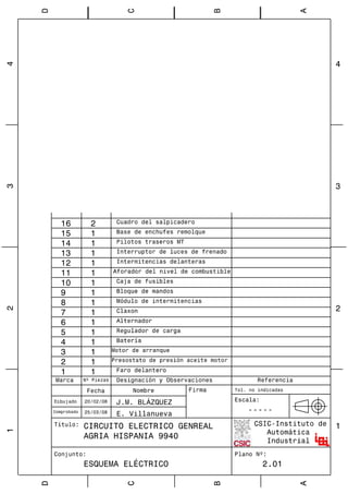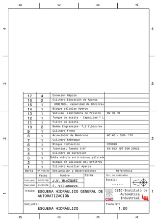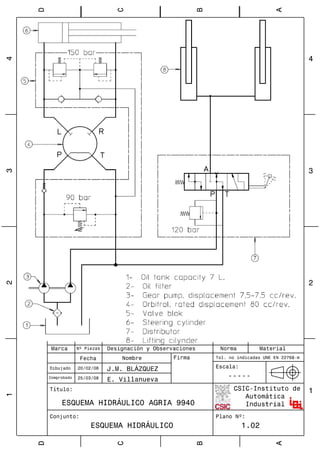 Este documento describe el proyecto de automatización de un tractor agrícola. Presenta un estado del arte de la robótica agrícola, incluyendo manipuladores y vehículos autónomos. Luego detalla el diseño e implementación de un sistema hidráulico y eléctrico para controlar automáticamente la dirección, frenos, embrague y otros componentes del tractor. Finalmente, valida el sistema a través de pruebas en un banco de pruebas y concluye que la automatización del tractor es factible y prometedora.