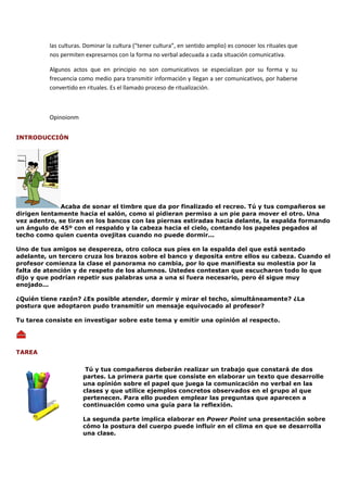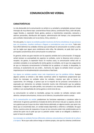 La comunicación no verbal incluye una gran variedad de mensajes como expresiones faciales, gestos, postura, vestimenta y espacio personal. Estos mensajes a menudo se envían simultáneamente y pueden contradecirse entre sí o ser confusos. La comunicación no verbal suele ser más importante que las palabras dichas y puede transmitir más información sobre el estado de ánimo y las intenciones del emisor. Los mensajes no verbales y su significado dependen de la cultura y época.