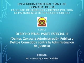 Este documento presenta información sobre el delito de cohecho en el derecho penal peruano. En particular, define las conductas, sujetos y bien jurídico protegido en este delito. Explica que el cohecho implica la aceptación de beneficios por parte de funcionarios públicos a cambio de incumplir u omitir sus obligaciones. Además, presenta estadísticas sobre casos de cohecho en Perú y describe las penas asociadas a este delito según el Código Penal peruano.