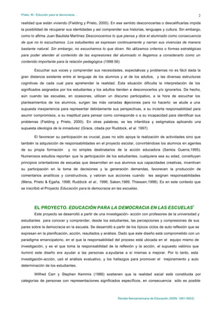Este documento describe un proyecto de investigación-acción que tuvo como objetivo conocer las percepciones de los estudiantes sobre la democracia en sus escuelas. El proyecto involucró a estudiantes investigadores que recolectaron información a través de entrevistas. Los resultados mostraron que muchos estudiantes desconocían el significado de la democracia y que esta estaba ausente en los procesos escolares, revelando deficiencias para vivirla plenamente. El proyecto buscó promover la participación estudiantil para mejorar la comprens
