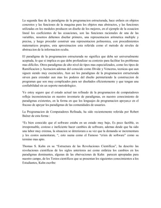El documento describe varios paradigmas de programación, incluyendo la programación estructurada y dinámica. También discute cómo los nuevos paradigmas pueden desarrollarse mediante la invención, elaboración y comunicación, y cómo los lenguajes de programación y comunidades de programadores a menudo se centran en paradigmas específicos.