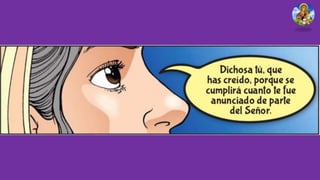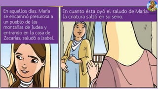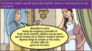 María visita a su prima Isabel después de que el ángel Gabriel le anuncia que será la madre de Jesús. Cuando María saluda a Isabel, el bebé que Isabel está esperando, Juan el Bautista, salta de gozo en su vientre. Isabel bendice a María y la llama bendita entre todas las mujeres. María se queda con Isabel durante tres meses antes de regresar a su hogar en Nazaret.