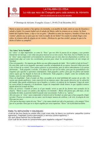 El documento presenta tres "claves" para comprender el misterio de la Navidad según el Evangelio del cuarto domingo de Adviento: 1) la clave de la pequeñez, ya que todo en la Navidad será pequeño y sencillo; 2) la clave de la fragilidad, pues Dios se hace vulnerable en la forma de un niño; y 3) la clave del servicio, como María que sirve aprisa a su pariente Isabel. Estas claves muestran un amor que se hace pequeño, frágil y servidor.