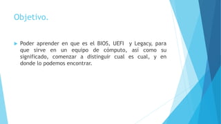 El documento describe las diferencias entre BIOS, UEFI y Legacy. BIOS es un programa que se carga en la memoria ROM y controla el hardware al iniciar el sistema. UEFI reemplaza a BIOS y permite arrancar sistemas operativos de 64 bits. Legacy se refiere a sistemas antiguos que aún se usan a pesar de ser obsoletos.