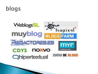 Un alojamiento o hosting proporciona servicios asociados a un dominio como correo, sitios web y servidores dedicados, permitiendo utilizar el dominio como un espacio para la empresa. Los foros se usan para conversar sobre temas de interés como videojuegos, música o programas de TV. Un wiki es un software que permite la creación colaborativa de contenido de forma rápida y sencilla para todos los usuarios. Una comunidad virtual conecta a personas a través de Internet en lugar de un espacio físico.