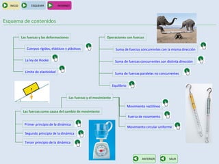 Este documento presenta un esquema sobre las fuerzas y las deformaciones. Explica conceptos clave como cuerpos rígidos, elásticos y plásticos, la ley de Hooke, límite de elasticidad, sumas de fuerzas concurrentes y no concurrentes, y equilibrio. El esquema proporciona ejemplos visuales para ilustrar estos importantes principios de la física.