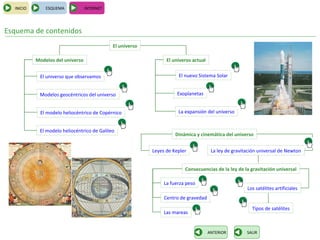 Este documento presenta información sobre diferentes modelos del universo a lo largo de la historia, incluyendo modelos geocéntricos como el de Aristóteles y Ptolomeo, y modelos heliocéntricos como los de Copérnico y Galileo. También describe las leyes de Kepler sobre el movimiento planetario y la ley de la gravitación universal de Newton. Finalmente, explica conceptos como la fuerza peso y la aceleración de la gravedad.