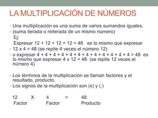 Este documento presenta una guía sobre multiplicaciones para cuarto básico. Explica que la multiplicación es una suma reiterada y presenta los pasos para realizar operaciones como multiplicar números de tres dígitos por números de un dígito. También describe propiedades como la conmutativa, asociativa y distributiva. Incluye ejemplos y ejercicios para que los estudiantes practiquen multiplicaciones.
