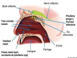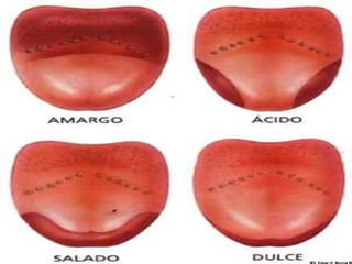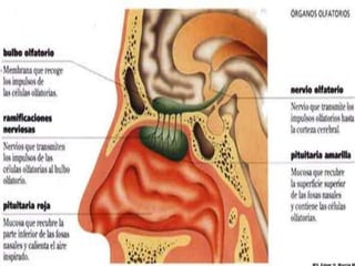 El documento trata sobre la fisiología del olfato y el gusto. Explica que el olfato está mediado por quimiorreceptores en la nariz que detectan moléculas olfativas y transmiten la señal al cerebro a través del nervio olfatorio. También describe algunas enfermedades que afectan el olfato como el resfriado común, la rinitis y la fiebre del heno. Con respecto al gusto, explica que está mediado por células gustativas en la lengua que detectan los cinco sabores