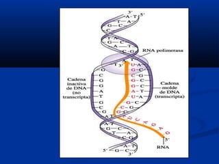 Este documento describe los procesos centrales de la biología molecular, la transcripción y la traducción. Explica que durante la transcripción, la información almacenada en el ADN se copia en ARN mensajero mediante la acción de las ARN polimerasas. Luego, durante la traducción, la información en el ARNm se decodifica en el ribosoma para sintetizar proteínas mediante la unión secuencial de aminoácidos guiada por el código genético. También compara estos procesos entre procariotas y euc