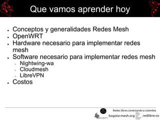 El documento describe un curso sobre redes libres y la implementación de redes mesh en Bogotá, abordando conceptos, hardware y software necesario, así como ejemplos de soluciones comerciales y el uso de OpenWRT. Se destaca la autogestión y sostenibilidad de las redes mesh, así como los requisitos técnicos para la implementación. Además, se mencionan plataformas como Nightwing-WA y Cloudmesh, útiles para la configuración y supervisión de estas redes.