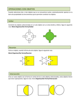 Este documento describe diferentes operaciones con objetos en CorelDRAW, incluyendo soldar objetos para convertirlos en uno solo, recortar un objeto usando la forma de otro, crear un nuevo objeto con la forma común de objetos superpuestos mediante la herramienta intersección, y simplificar objetos eliminando partes no visibles. También explica cómo usar las formas de objetos delante o detrás para recortar otros objetos, y crear un nuevo objeto con la forma de varios objetos seleccionados. Por último, brinda instrucciones sobre cómo cre
