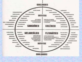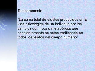 El documento describe los cuatro temperamentos principales (sanguíneo, colérico, melancólico y flemático), explicando las características clave de cada uno. Los temperamentos se basan en las diferencias en el sistema nervioso y cómo una persona interactúa de forma natural con el entorno. También se discuten las fortalezas y debilidades de cada temperamento, así como posibles vocaciones adecuadas y cómo tratar a alguien con ese temperamento.