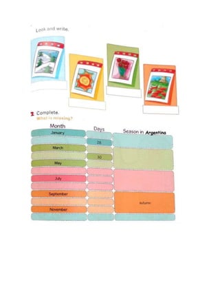 El documento presenta una lección sobre las cuatro estaciones del año (primavera, verano, otoño e invierno) y los meses del año. Los estudiantes deben identificar los nombres de las estaciones en unos dibujos y completar información sobre los meses del año, incluyendo el número de días de cada mes y la estación correspondiente. Luego interactúan con un amigo llamado Webby respondiendo preguntas y jugando a un juego para encontrar meses, números y estaciones del año en una pista.