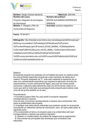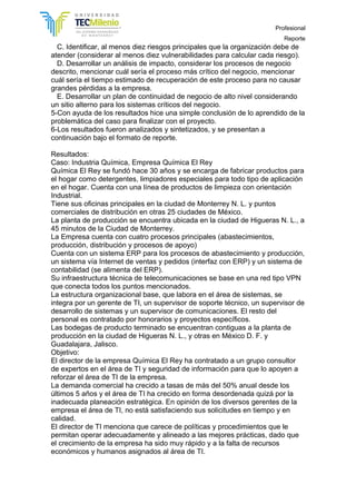 Este documento presenta los resultados de un proyecto integrador de tecnologías de información realizado por Sergio Chávez Sandoval para el curso impartido por Mayra Alejandra Rodríguez Arriaga. El proyecto involucra el análisis de riesgos y plan de continuidad de negocios para la empresa Química El Rey. Los resultados incluyen un modelo básico de análisis de riesgos, las 10 principales amenazas identificadas y los 10 principales riesgos que debe atender la organización.