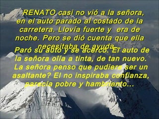 Renato ayuda a una señora con una llanta pinchada en la carretera en medio de la noche bajo la lluvia. Ella le ofrece pagarle pero él se niega y le dice que en vez de eso ayude a otra persona necesitada. Más tarde, la señora ayuda económicamente a una camarera embarazada en un restaurante dejando dinero y un mensaje para continuar el círculo de ayuda. La camarera queda conmovida por la generosidad recibida que le ayudará a ella y a su familia.
