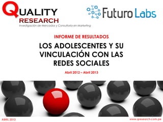 El informe de QResearch sobre adolescentes y redes sociales en Lima, correspondiente a abril de 2013, analiza los hábitos y preferencias de uso entre adolescentes de 12 a 16 años. Se constató un aumento en el uso de computadoras en casa y la preferencia por celulares para el acceso a redes sociales, siendo Facebook la red social más popular. A pesar de una ligera disminución en la frecuencia de ingreso, el tiempo promedio de conexión ha aumentado significativamente.