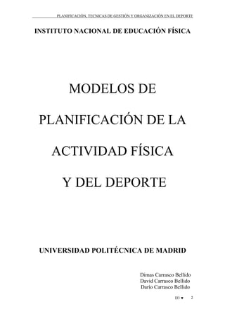 Este documento describe los fundamentos de la planificación y organización deportiva. Explica que la planificación implica ordenar los recursos para alcanzar objetivos y debe seguir ciertas fases como establecer objetivos, recopilar datos, ordenar la información, tomar decisiones, ejecutar y evaluar. También habla sobre los tipos de organigramas usados en las organizaciones deportivas como los verticales, horizontales y circulares.