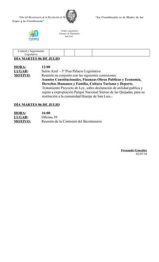 El documento resume las reuniones de comisiones de la Cámara de Diputados de la provincia de San Luis durante los días lunes 5 y martes 6 de julio de 2010. Se detallan las comisiones, días, horas y lugares de las reuniones, así como los expedientes que se tratarán en cada una. También se informa sobre una reunión conjunta de varias comisiones el martes 6 a las 12:00 para tratar un proyecto de ley sobre la declaración de un parque nacional, y sobre una reunión de la Comisión del Bic