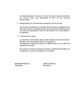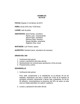 La asamblea se llevó a cabo el 21 de febrero de 2015 en Bogotá con la presencia de 6 miembros y un invitado. Se verificó el quórum necesario y se aprobaron el orden del día y la comisión encargada de firmar el acta. Finalmente, se aceptó la solicitud de retiro de un miembro y el ingreso de un nuevo miembro a la cooperativa.