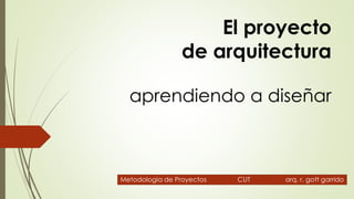 El documento presenta una discusión sobre el concepto de proyecto en arquitectura. Explica que un proyecto implica analizar las necesidades, idear soluciones conceptuales y representarlas gráficamente para materializar una obra arquitectónica. También involucra todo el proceso de diseño, desde el análisis inicial hasta la documentación final requerida para la construcción. El proyecto transforma una idea en realidad a través de la labor del arquitecto.