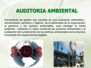 La auditoría ambiental es una herramienta de gestión que evalúa de manera sistemática y periódica la efectividad de las prácticas y políticas ambientales de una organización para proteger el medio ambiente. Existen auditorías ambientales internas y externas. Algunos tipos de auditoría incluyen auditorías preliminares, de cumplimiento legal, de sistemas de gestión ambiental, de riesgos, de residuos, de procesos y energéticas. El proceso de auditoría ambiental consiste en las etapas de pre-auditoría, auditoría
