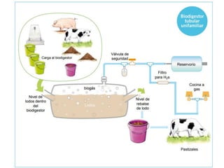 Este documento describe la energía de biomasa y el proceso de digestión anaeróbica para producir biogás. Explica que la biomasa se refiere a materia orgánica de origen biológico y puede clasificarse como primaria, secundaria o terciaria. Luego describe los componentes de un biodigestor, incluido el reactor, las pozas de entrada y salida, y las tuberías para el biogás y los sólidos. Finalmente, explica que el biodigestor convierte la biomasa en biogás a través de las et