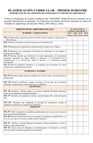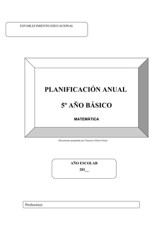 Este documento presenta la planificación anual de matemáticas para 5o año básico. Se distribuyen los objetivos de aprendizaje en cuatro unidades por semestre, con objetivos específicos para cada unidad. También se describen los recursos y métodos de evaluación. El plan busca desarrollar actitudes positivas en los estudiantes hacia las matemáticas.